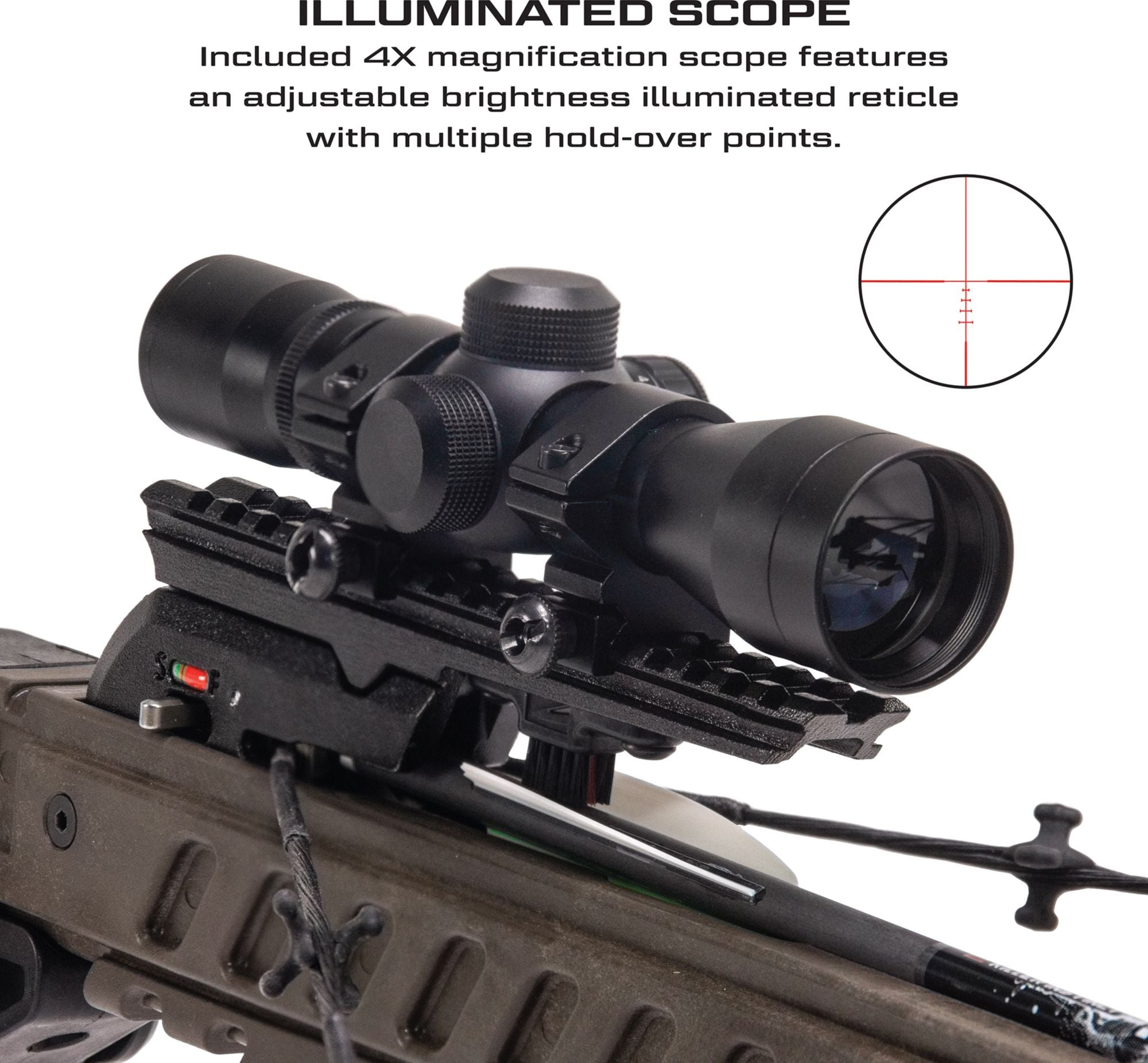 The FUEL 415 Crossbow Kit from Killer Instinct delivers the convenience of a built-in RDC Crank making it easy to cock your crossbow with very little effort. Featuring plenty of performance, premium crossbow bolts and a lighted 4x32 scope, The Fuel has everything you need to get started.