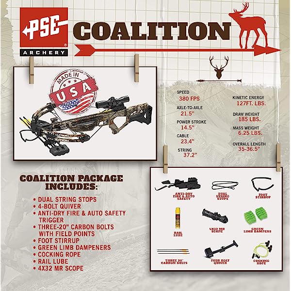 • Coalition Crossbow Package- Adjustable Stock- Dual String Stop- Up to 380 fps- 5 Bolt Quiver- Let Off 70% & More