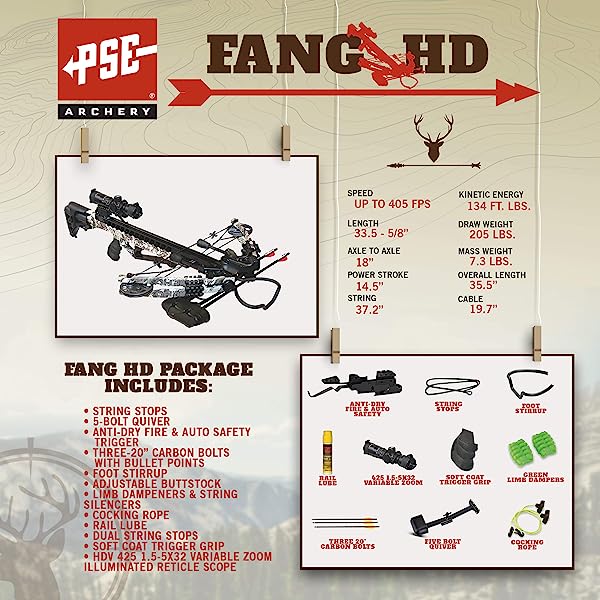 • Fang HD Crossbow Package- Up to 405 FPS- 5 Bolt Quiver- Adjustable Buttstock- w Dual String Stops