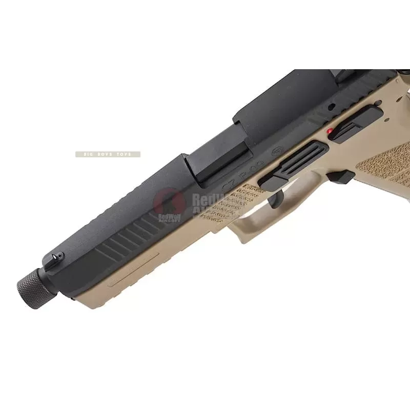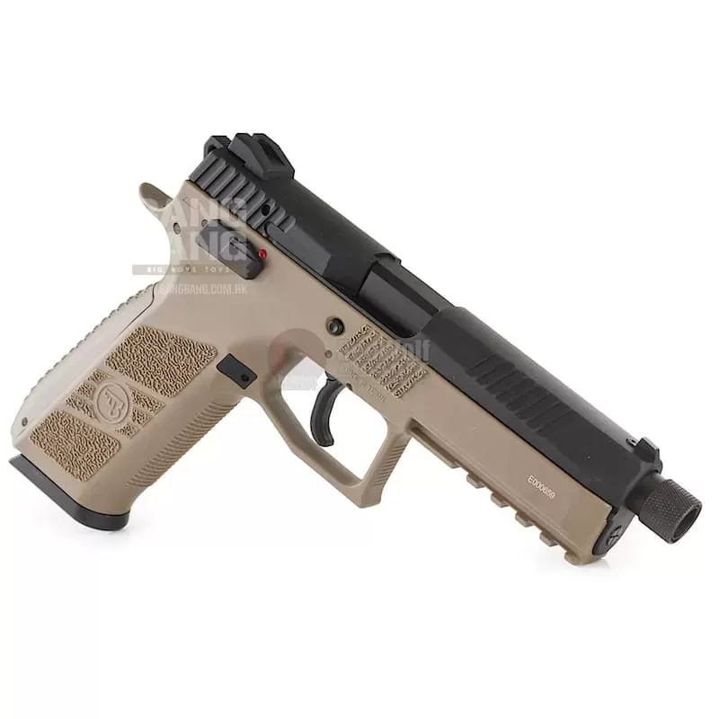While the KJ Works P-09 Duty may look amazing, the feel of it with it comes to the materials and the way it shoots is just as brilliant. It features a polymer frame with a metallic slide. On the frame itself is a accessory rail for all your accessory needs. The grip is 'noodle' textured but very comfortable to it, as it should be since it kicks like a mule. This version comes with a 14mm CCW thread allowing you to add suppressors to this already great looking pistol.
