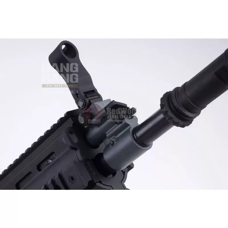 The upper receiver features a 13 inch carbine length barrel with the AAC type flash hider and have rails on all 4 sides, that gives great flexibility to fulfill with mission requirements, no matter it's laser designators, flashlights, fore grips, backup sights you will find enough space to fit them all on if required so. Hop up adjustment is located behind the lower rail, adjustable with flat head screw drivers. Charging handle is reciprocating, and could be changed to either side tailored to user's preference. Iron sights are flip up 600m type with windage and elevation adjustments. .