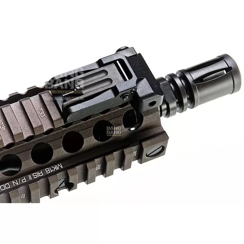 The MK18 Mod 1 we have here is a faithful replication of the same model fielded by the many special operators. The gun is a fully licensed product so you will get authentic markings. The gas system is superb and the felt recoil is extremely satisfying. GHK has always done exceptional work in regards to their gas system and quality of their gun and this one is no exception. The over all lighter weight when compared with other models on the market makes this gun a great shooter and lighter magazines make it much easier to carry multiple at once.