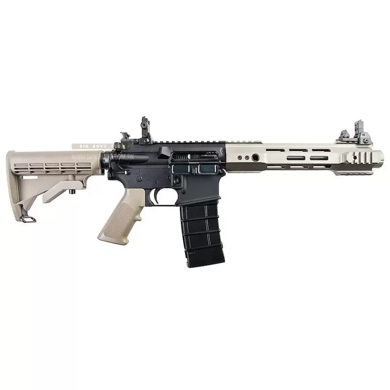This KJ Works M4 GBBR is a face lifted, refreshed version of the KJ M4 GBBR. This particular rifle is light weight and designed to be CQB length. The rifle itself comes in a handsome two tone with the stock and rail being a tan/fde color. To cap it off, the rifle features a blast shield style muzzle device and flip up front and rear sights.