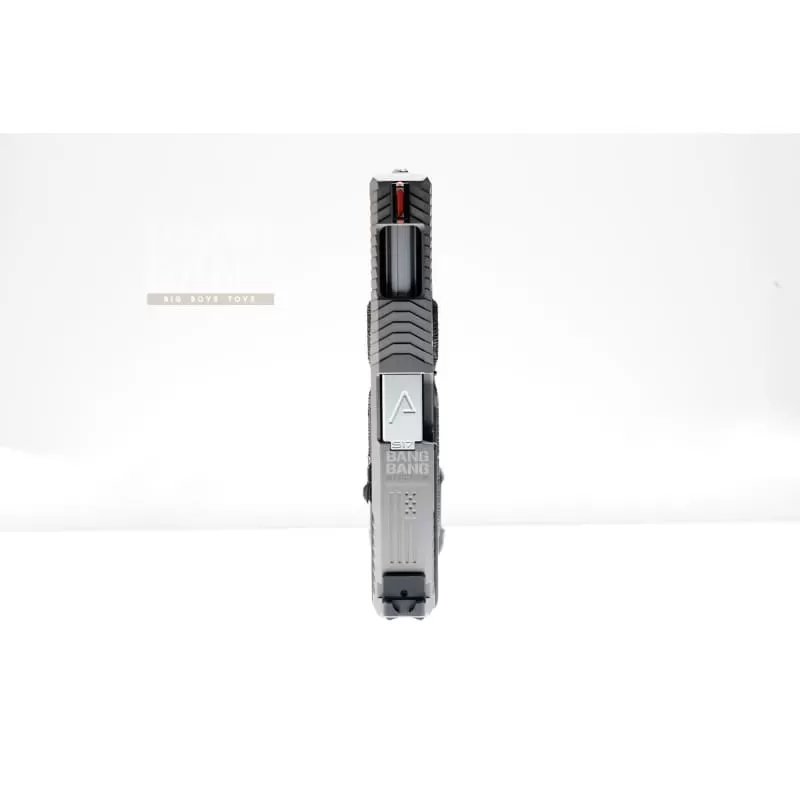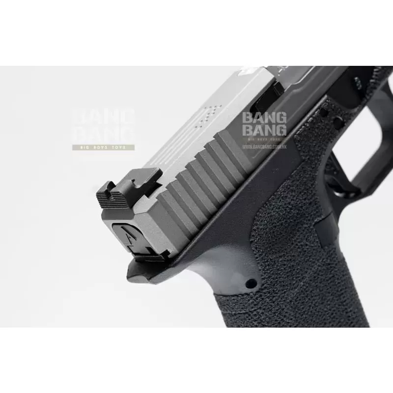 Progressing past the trigger is the frame. As stated, this is a fully licensed Timberwolf frame by Lone Wolf Distributors and upon casual inspection, it already bears stark differences from the basic Glock frame. To start, it features a straighter grip angle for a more natural grip and a higher beavertail designed to better mitigate recoil. Agency Arms took it one step further by having it modded to their specifications. The frame seen on the EXA pistol features the signature accelerator cuts towards the front that acts as a thumb shelf for better recoil control and the reversible magazine release makes this pistol friendly for both left and right-handed shooters. The faux stippling seen on the EXA pistol is called "Shark Scale" and offers probably one of the best out-of-the-box gripping experiences seen on any pistol of this kind. Furthermore, the frame comes with the ability to change out its back-straps for a more custom fit for shooters that might be more comfortable with 1911s, XDMs, or SIGs (depending on the back-strap used, slimline for 1911s, or contoured for XDM and SIG). It's no surprise that many real steel Glock users upgrade to the Timberwolf frame!